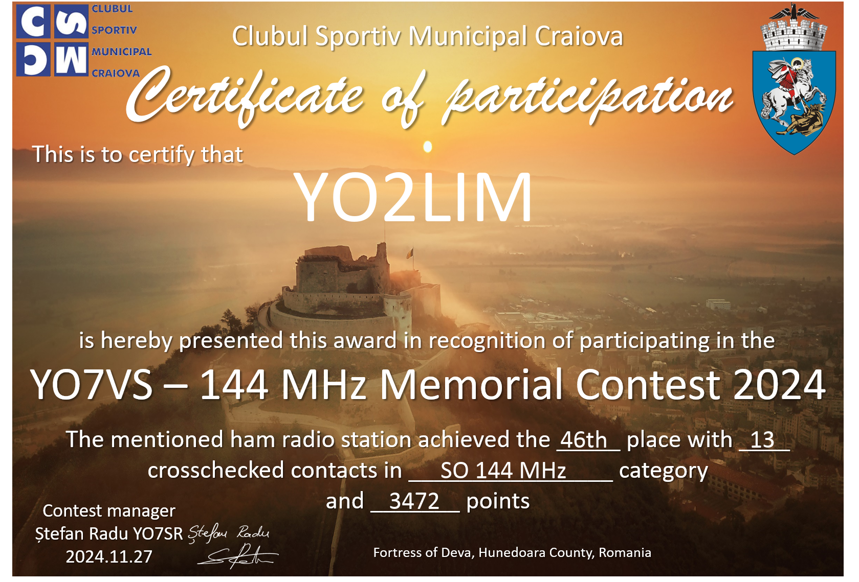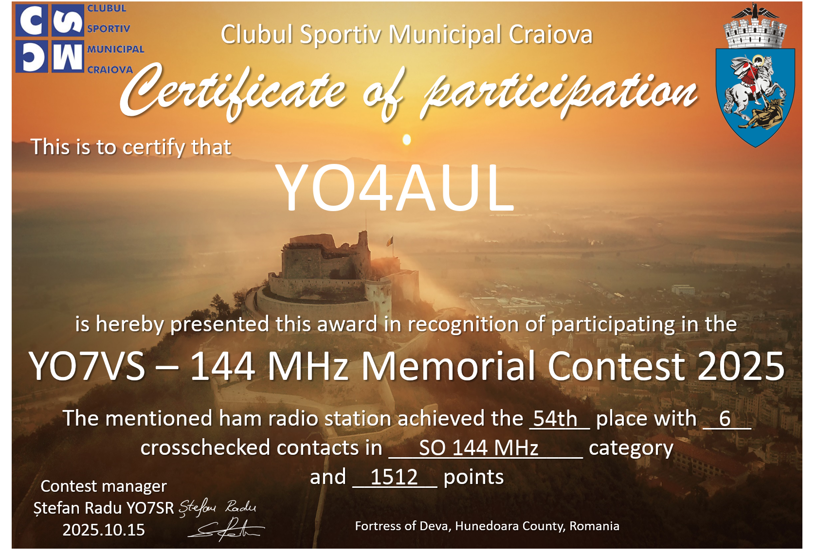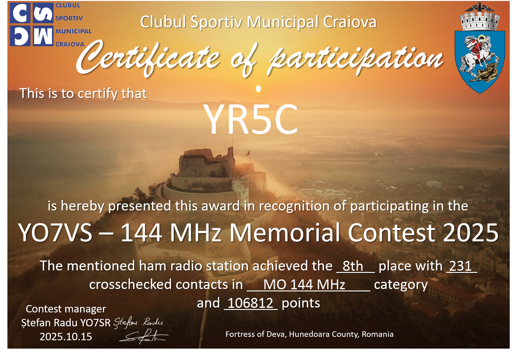 | 25 | YO9CWY | 24 | 1 | 4.0 | 1 | 4718 | 196.6 | yagi 5 ele | 20 | 9A4V (723 km) | map | YO9CWY award |