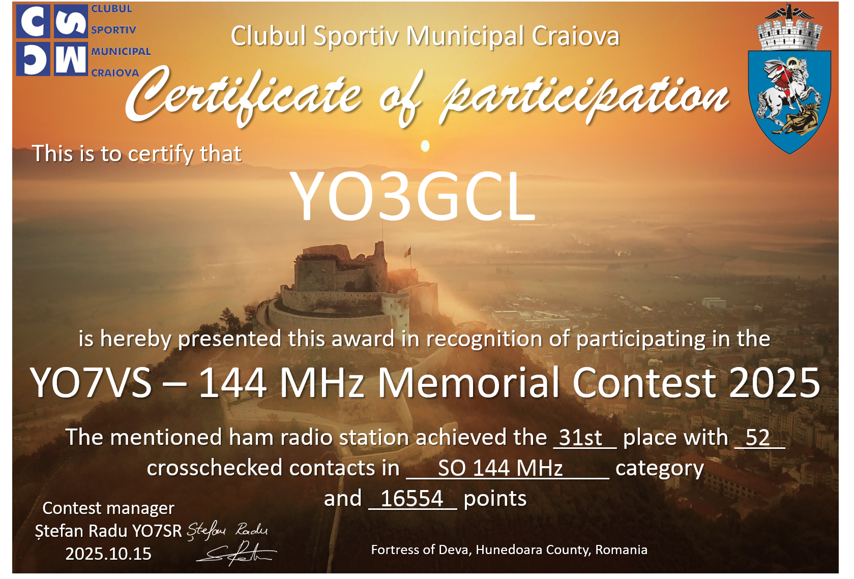 | 14 | YO3GCL | 52 | 1 | 1.9 | 0 | 16554 | 318.3 | HM 10 EL YU1EF | 100 | 9A0BB (832 km) | map | YO3GCL award |