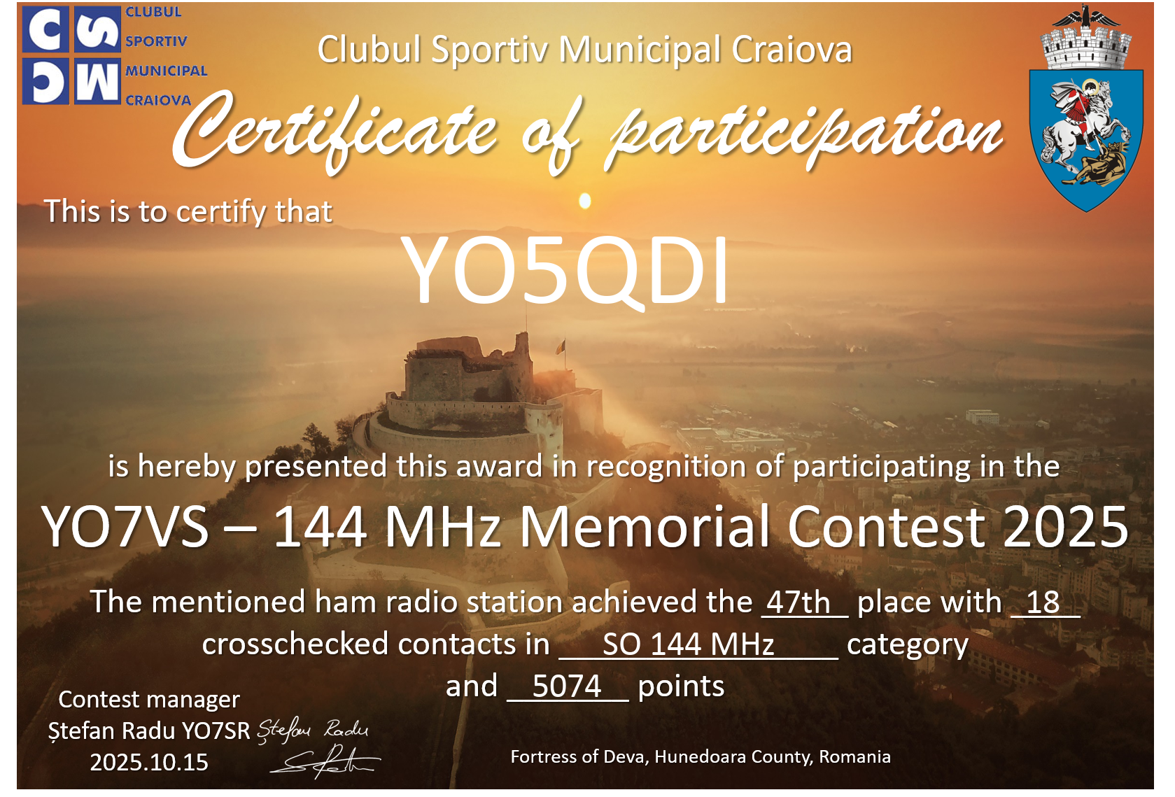 | 15 | YO7LDT | 44 | 12 | 21.4 | 1 | 13891 | 315.7 | 7 el Yagi | 100 | IQ5NN (911 km) | map | YO7LDT award |