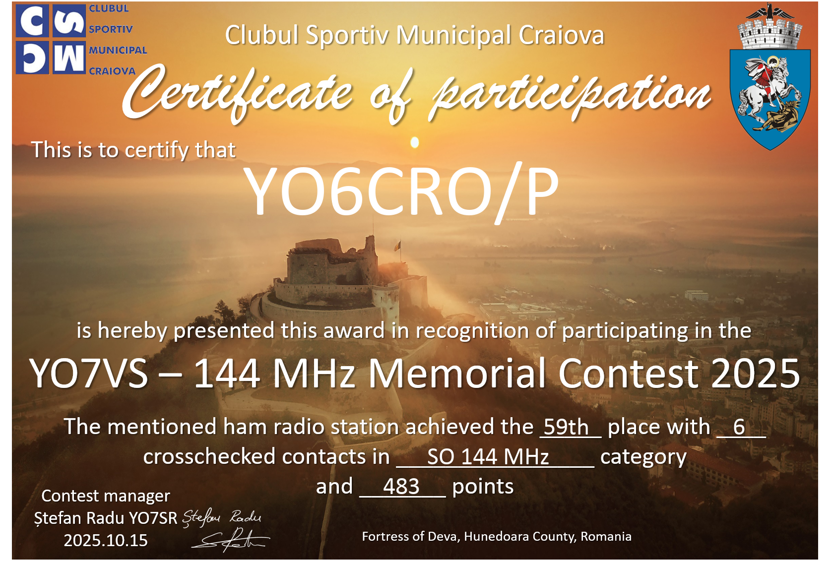 | 34 | YO6CRO/P | 6 | 0 | 0.0 | 0 | 483 | 80.5 | yagi 12 elemente. | 10 | YP2DX/P (120 km) | map | YO6CRO/P award |
