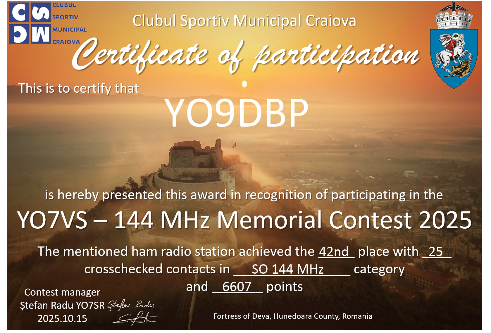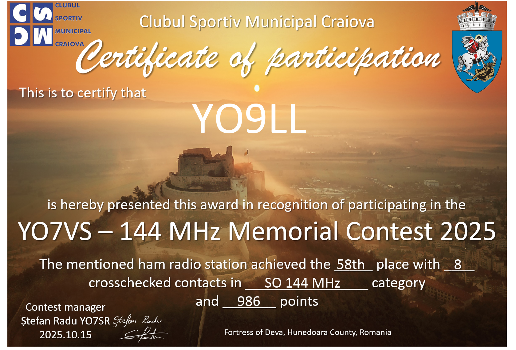 | 23 | YO9BHI | 25 | 2 | 7.4 | 0 | 6110 | 244.4 | Yagi 9 el | 35 | 9A4V (730 km) | map | YO9BHI award |